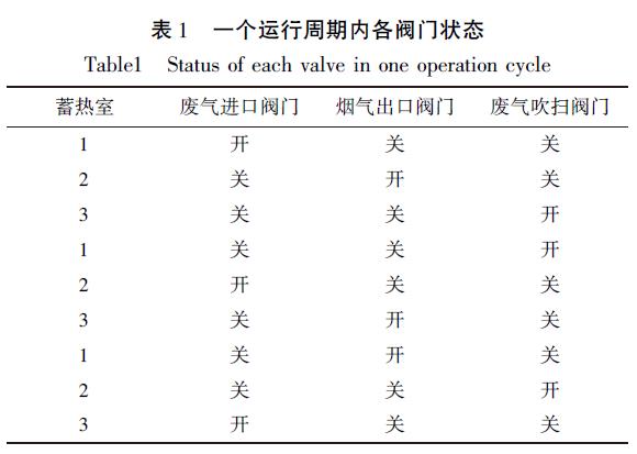 程因為是通過程序控制氣動調節(jié)閥工作, 能在短時間內切換閥門狀態(tài), 保證三個蓄熱室一次完成蓄熱、放熱和吹掃的過程。在一個運行周期內每個蓄熱室下的閥門切換狀態(tài)如表1 所示。