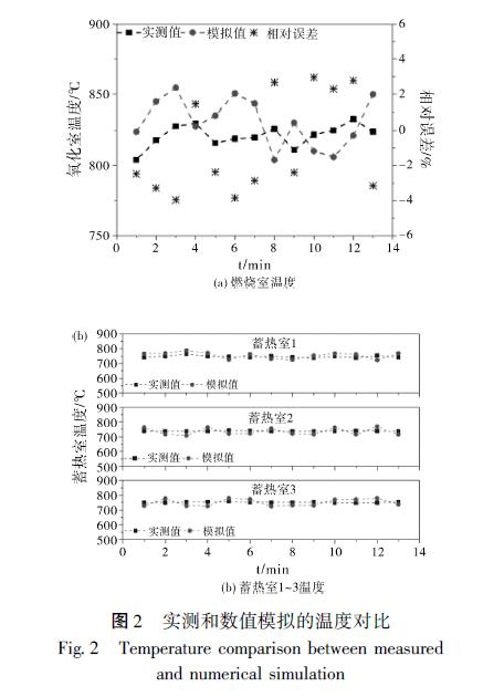 在連續(xù)監(jiān)測穩(wěn)定運行階段多個切換周期后, 將燃燒室三個熱電偶及變送器監(jiān)測的爐膛溫度值計算得到平均值, 同時將每個蓄熱室中的出口位置熱電偶的溫度值進行記錄, 圖2 為同一測點的工程實際數據與數值模擬值的對比。通過對比, 得到溫度模擬數據與實際監(jiān)測值的相對誤差均在4% 以內, 這也可能