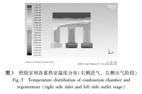 量, 因此在豎直方向蓄熱體和氣體都呈現(xiàn)出明顯的溫度梯度。同時, 當進氣排氣方向發(fā)生變化時, 燃燒室內溫度也會出現(xiàn)波動, 且分布不均勻。對于燃燒室結構, 也有裝置將燃燒室頂部兩側的直角改為切角, 使得煙氣湍流充分, 減小低溫區(qū)出現(xiàn)的可能性