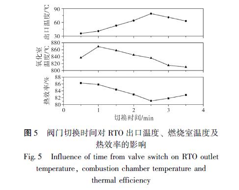 分, 不利于提高熱效率和廢氣處理效率。同時, 熱效率也隨著切換時間的增加而減少, 不利于VOCs 的高效處理和余熱利用。切換時間的逐漸增加在2 ~ 2. 5 min 時, 蓄熱室吸收的熱量增加, 導致蓄熱室與煙氣的溫差減小, 排氣出口溫度升高, 且燃燒室溫度和熱效率仍有降低。隨著切換時間的進一步增加到2. 5 分鐘以上, 進氣過程的蓄熱室溫度進一步下降, 導致進氣蓄熱體和燃燒室中的氣體溫度繼續(xù)下降, 在排氣過程中供給蓄熱體吸收的熱量減少, 排氣出口溫度開始下降, 有利于熱效率的提高。