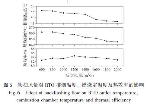 吹掃過程是通過吹掃風機將殘留在蓄熱室內的VOCs 帶入燃燒室, 以提高廢氣的效率[11] 。但目前RTO 反吹風量的設計大多基于工程經驗, 對不同工況下的實際運行參考性不高。為了研究吹掃風量對RTO 裝置運行的影響, 試驗設定在廢氣流量8000 m3 / h, 切換時間2 min 且無電加熱的條件下, 模擬吹掃風量從600 m3 / h 增加到2000 m3 / h 時出口溫度、燃燒室溫度和熱效率變化情況。如圖6 所示。由于吹掃風是從排至煙囪的煙氣中抽取, 實際吹掃風中含有的VOCs 濃度較低, 無法給燃燒室提供多的。同時, 過大的吹掃風量增加了進入進氣和排氣蓄熱室的流量, 降低了實際發(fā)生氧化反應的廢氣的預熱溫度, 且降低了出口溫度。雖然熱效率在1200 m3 / h 吹掃風量附近有一定程度的增加, 但結合燃燒室溫度和經濟因素,800 ~1000 m3 / h 區(qū)間內較為合理與實際工程經驗吹掃風量占進氣流量的10% 左右結論相近[12] 。同時可以看出, 吹掃風量越大, 燃燒室的溫度越低, 需要開啟電加熱器提供熱量來提高燃燒室的溫度, 增加運行成本。