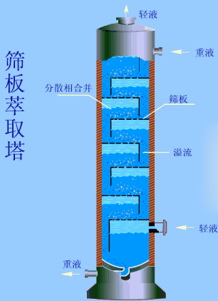 工作原理:往復(fù)篩板塔又稱振動(dòng)篩板塔。塔內(nèi)裝帶有許多塊篩板的往復(fù)振動(dòng)的中心軸的設(shè)備,中心軸通過塔頂?shù)尿?qū)動(dòng)裝置帶動(dòng)板串在塔中做垂直方向的往復(fù)運(yùn)動(dòng),從而對(duì)塔內(nèi)逆流流動(dòng)的兩液相起攪拌和分散作用。板串往復(fù)運(yùn)動(dòng)的振幅、頻率可以調(diào)節(jié),由于往復(fù)篩板塔具有處理量大、效率高、操作彈性大和結(jié)構(gòu)簡單等優(yōu)點(diǎn)而廣泛運(yùn)用在制藥、石油化工、濕法冶金和廢水處理等工業(yè)部門。